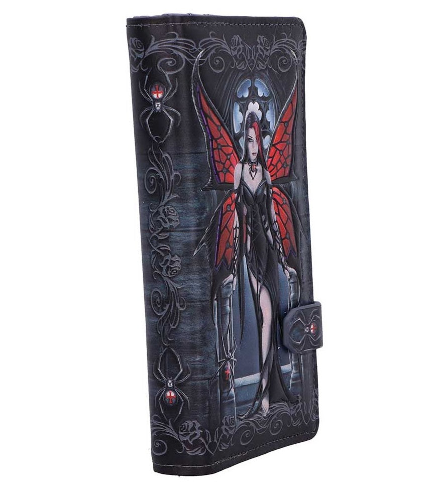 An embossed purse showcasing artwork by artist Anne Stokes, capturing a gothic fairy with black widow-inspired wings and attire.