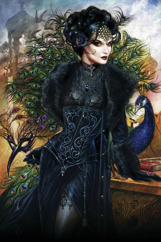 A deliciously dark puzzle to make your friends envious of your puzzling table. Discover the magical world of Alchemy as you puzzle the spectacular stare of Le Mauvais Oeil, guarding her precious peacock. Dressed in a beautiful black bodice and dressed to impress it is hard to look away from this enchanting puzzle. Fantasy lovers will love piecing this puzzle together as they enter another world of fantasy and own a piece of Avalon in your home.