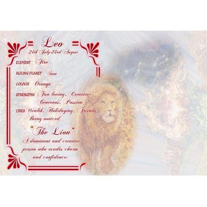 Inside: Cards inside reveal Element, Ruling Planet, Color, Strengths, Likes & a short general summary of star sign Characteristics