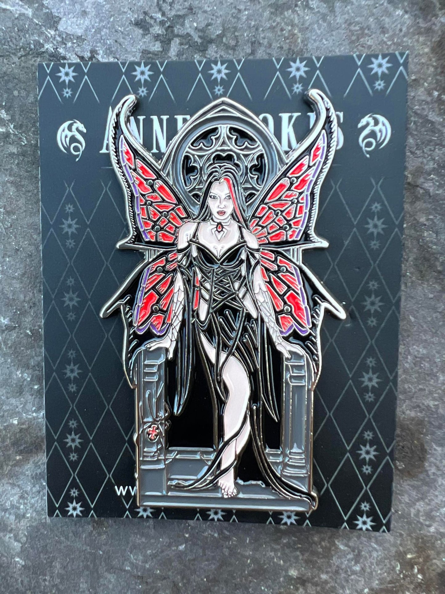 Designed by Anne Stokes, this Aracnafaria enamel pin measures approximately 7cm by 4cm at its widest points. (2.75" x 1.57")
