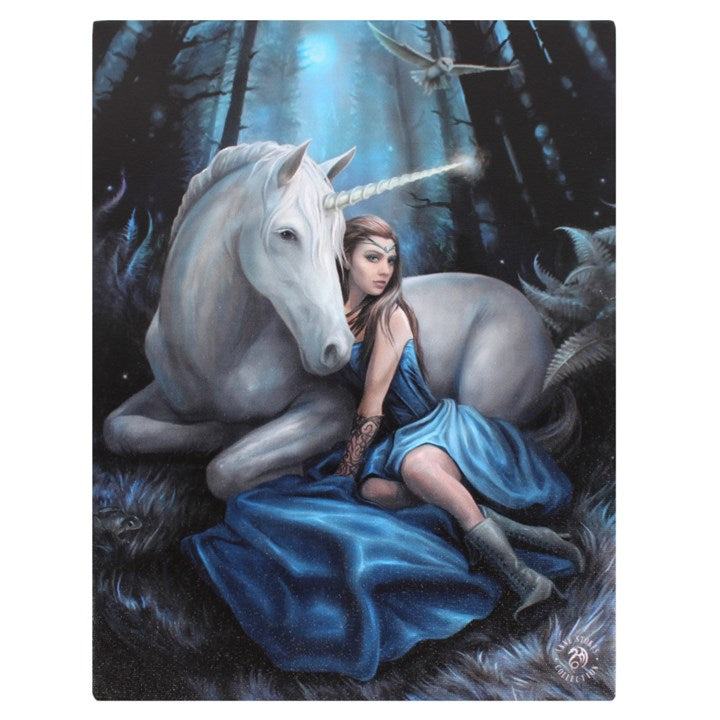 This small canvas plaque features the stunning 'Blue Moon' artwork design by the talented Anne Stokes. This mystical piece features an elegant unicorn and woman in a misty forest.