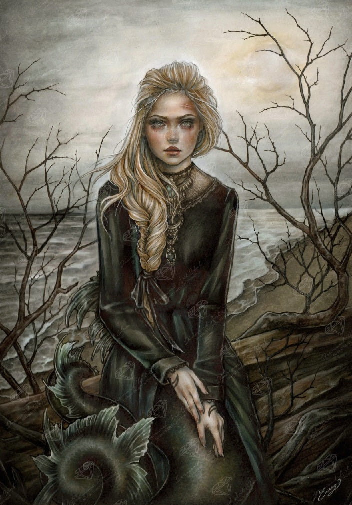 Find your place in a windswept seascape betwixt the sea and the shore. A mermaid with somber expression and flowing hair blends seamlessly into the eerie calm, captivating the imagination and evoking tales of ancient myths.