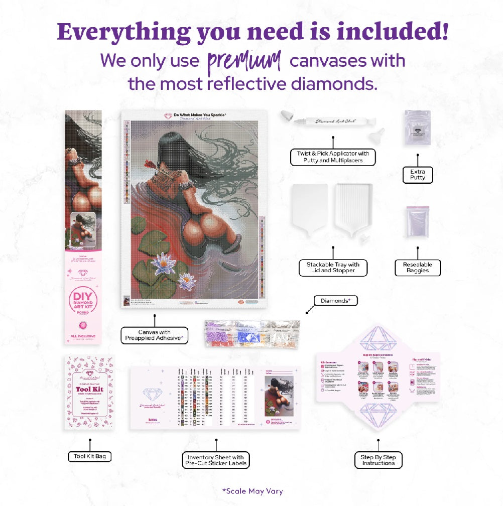 Canvas x 1, Diamonds, Tray x 1, Applicator + Grip x 1, Wax x 2, Tweezers x 1