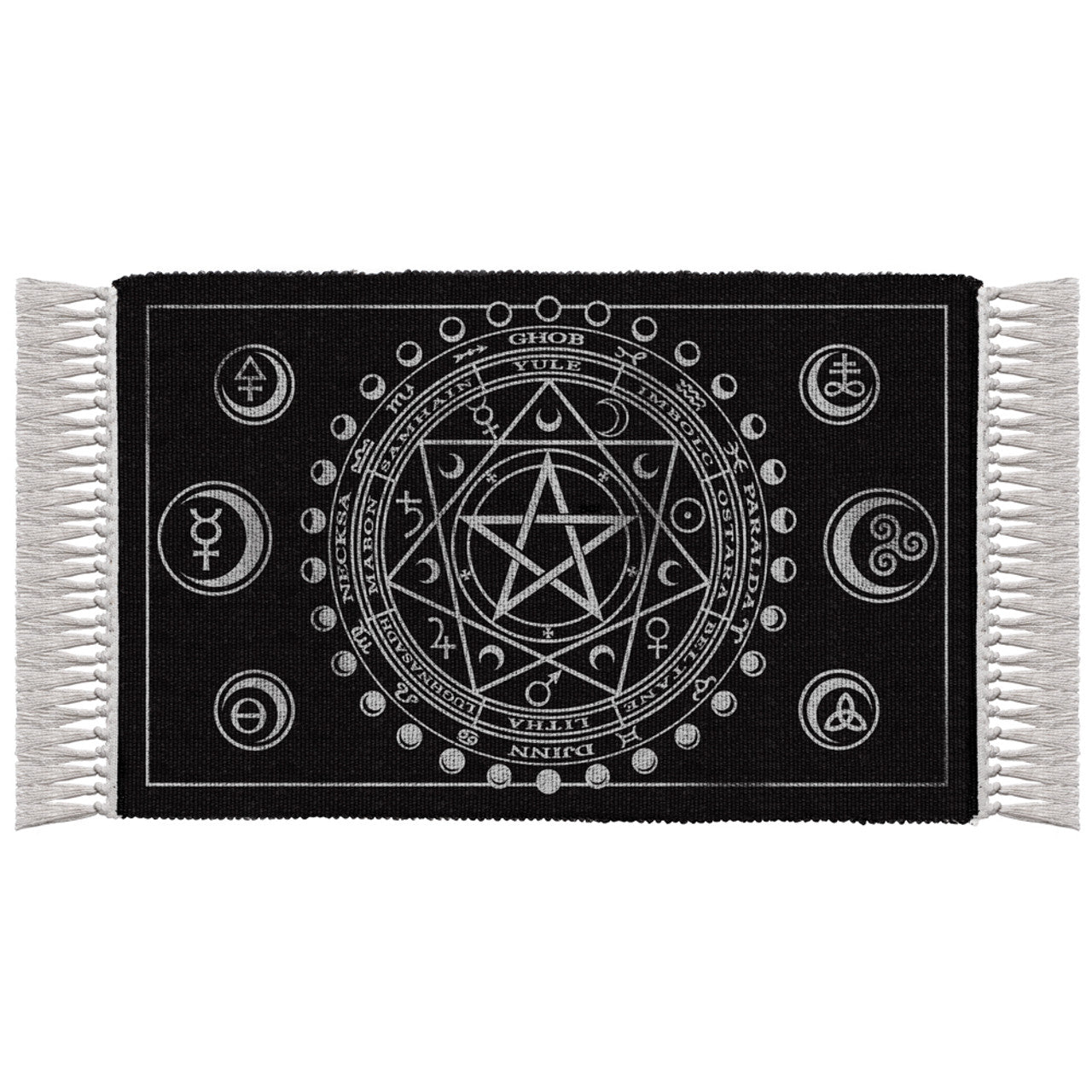 A beautiful hand woven, tasselled wiccan inspired rug. Featuring symbols of wiccan festivals, elements and moon phases.