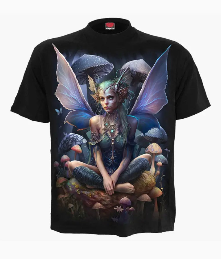 Come on a trip through the psychedelic forests of a fantastical fairy wonderland. Feel the vibrations of the earth spinning on its axis as it hurtles through space and realize that we are all connected by an invisible, warm glowing aura. This fairy queen is surrounded by mushrooms that enhance and focus her energies, making her at peace with herself and her surroundings. Front Print T-Shirt Black is made of Top Quality 100% Cotton, Jersey using skin friendly, Azo-free, Reactive dyes.