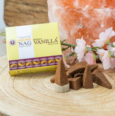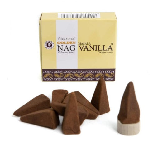 Golden Nag Vanilla incense cones from Vijayshree Fragrance from Bangalore, India. This incense is one of the most popular incenses of the world with its enchanting and captivating aroma. The best spices, herbs, flower extracts, exotic oils and other natural ingredients are carefully selected and skillfully blended.