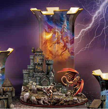 A mighty axe-wielding warrior defends his mountain castle against the fierce flames and slashing claws of the great red dragon in this original fantasy sculpture. The candleholder backdrop is adorned with details of Jeff Easley’s captivating artwork illuminated by the candlelight within to recreate the fiery glory of aerial dragon combat. The unique design is highlighted with the warmth of 22K gold, gleaming like the treasure of a dragon’s lair in the candle’s glow.