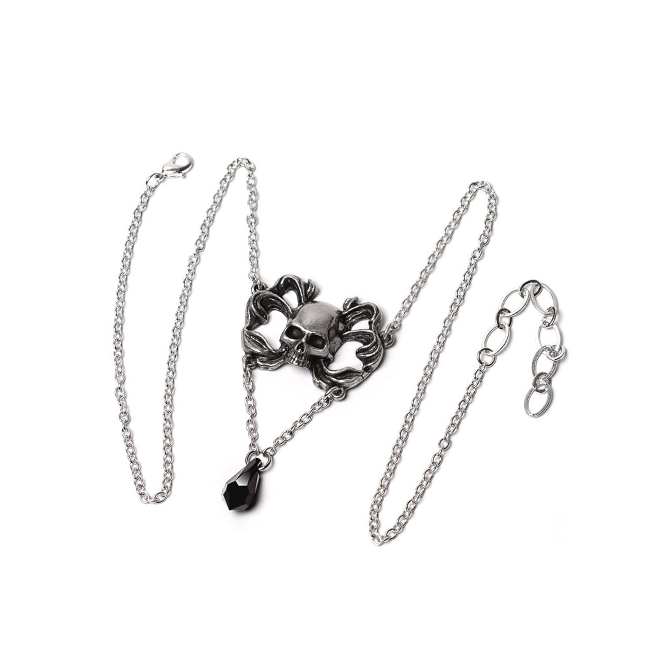 This captivating necklace features a beautifully crafted polished skull adorned with intricate baroque detail. Suspended from delicate chains, this necklace exudes a sense of sophistication while maintaining its rebellious spirit. The piece is elegantly finished with a stunning jet black Austrian fine cut crystal, adding a touch of glamour to a dark look!