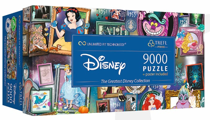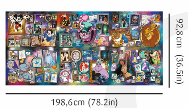 The Greatest Disney Collection puzzle is a must-have for any Disney enthusiast and puzzle lover. With 9,000 pieces, it ensures hours and hours of challenging and captivating fun. The puzzle showcases an array of iconic and beloved Disney characters, bringing the magic of Disney right into your living room. You'll find Cinderella, the timeless princess who captured everyone's hearts with her glass slipper. Snow White, the fairest of them all, is also there, with her adorable dwarf friends. Jumbo the Flying Elephant, the lovable and adventurous pachyderm, is ready to take flight into your imagination. And of course, Sleeping Beauty, the enchanting princess cursed by Maleficent but awakened by true love's kiss.